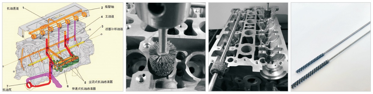 The main oil passage holes of the engine are narrow and long, with some having a length-to-diameter ratio greater than 28. There are multiple cross holes inside the holes, and there may be burrs remaining. To solve this problem, an abrasive-containing high-efficiency hole brush is used. Through high-speed rotation and reciprocating motion, it can effectively remove impurities and burrs in the oil passage. The brush material is soft, and it will not cause air hole blockage like that caused by sand wheels or grinding belts.